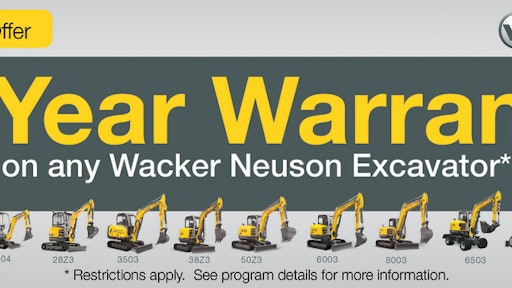 Wacker Neuson is offering a special five-year extended warranty for all 10 of its excavator models purchased between July 1, 2013 and September 30, 2013. This limited-time warranty includes a five-year/5,000-hour extended powertrain and hydraulics warranty.